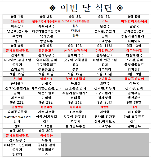 9¿ù ¿ì¸®¼¾ÅÍÀÇ ±Þ½Ä ½Ä´ÜÇ¥ÀÔ´Ï´Ù.