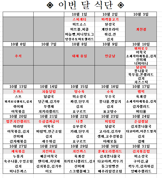 10¿ù ¿ì¸®¼¾ÅÍÀÇ ±Þ½Ä ½Ä´ÜÇ¥ÀÔ´Ï´Ù.