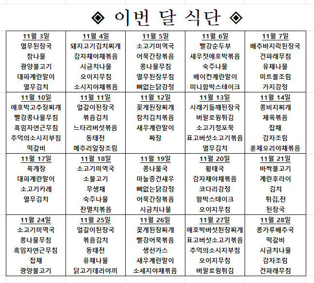 11¿ù ¿ì¸®¼¾ÅÍÀÇ ±Þ½Ä ½Ä´ÜÇ¥ÀÔ´Ï´Ù.