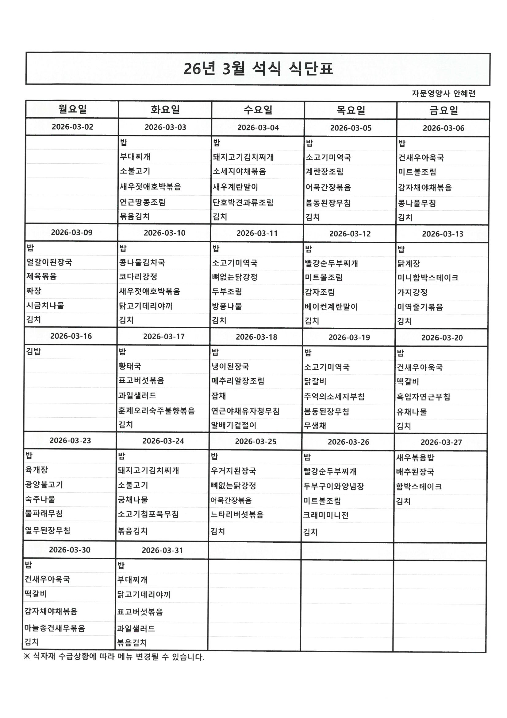 3¿ù ¿ì¸®¼¾ÅÍÀÇ ±Þ½Ä ½Ä´ÜÇ¥ÀÔ´Ï´Ù.